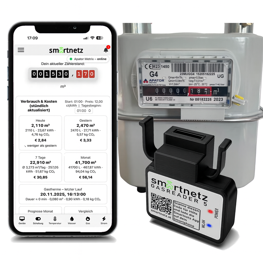 SMARTNETZ GASREADER 5 für Apator/Metrix G4 / G1,5 / G6 und G12 Plug & Play Einrichtung via App - (Nicht Für BK Gaszähler!) WiFi mit TASMOTA 32 vorinstalliert | HOMEASSISTANT | WLAN | MQTT | BK4 USB C