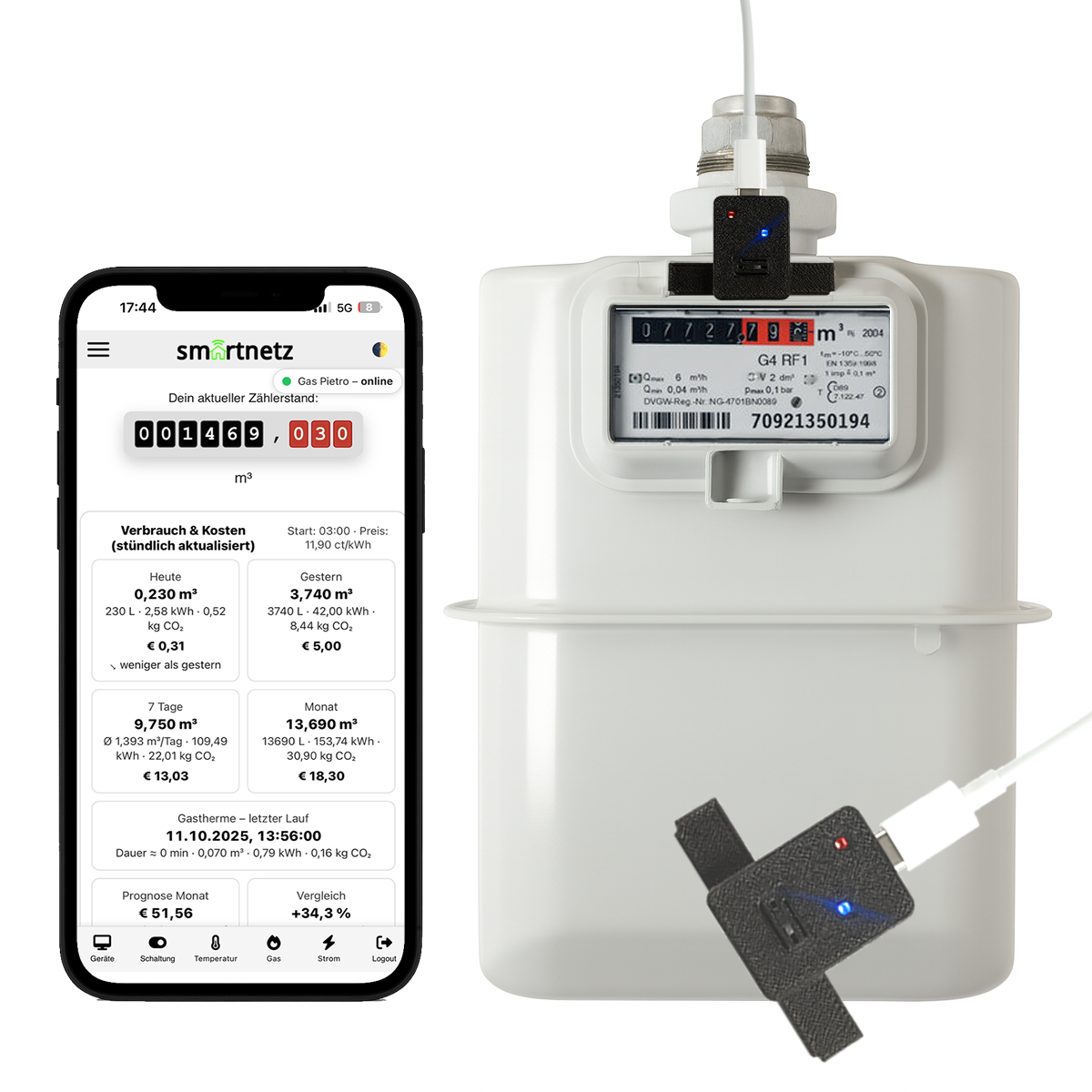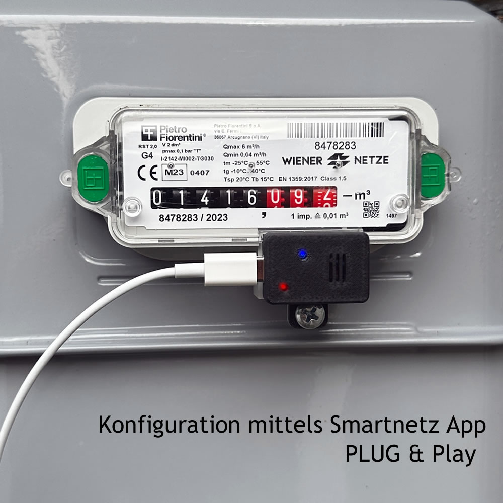 SMARTNETZ GASREADER 5 Plug & Play - konfigurierbar via App - Gasablesegerät mit Tasmota Firmware für Pietro Fiorentini / SAMGAS Gaszähler