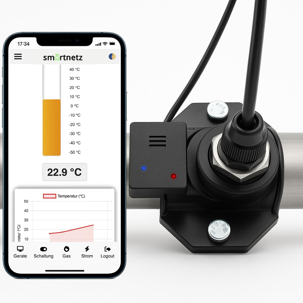 Smartnetz WLAN Pool und Teichthermometer Klemme für PVC U Rohr 50mm, PLUG & Play in der Smartnetz App, Tasmota 14.5 (Deutsch) vorinstalliert für Homeassistant & IO Broker, MQTT & Matter Support, USB C
