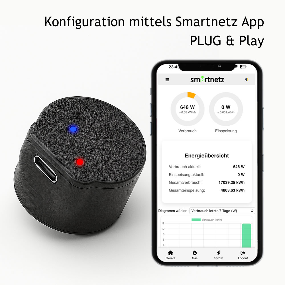 SMARTNETZ STROMREADER 5 Plug & Play / Einrichtung via Smartnetz App - Lesegerät für Smartmeter - mit TASMOTA 32 / Version 14.5 in Deutsch vorinstalliert Homeassistant | WLAN | MQTT | Matter | Wifi | USBC