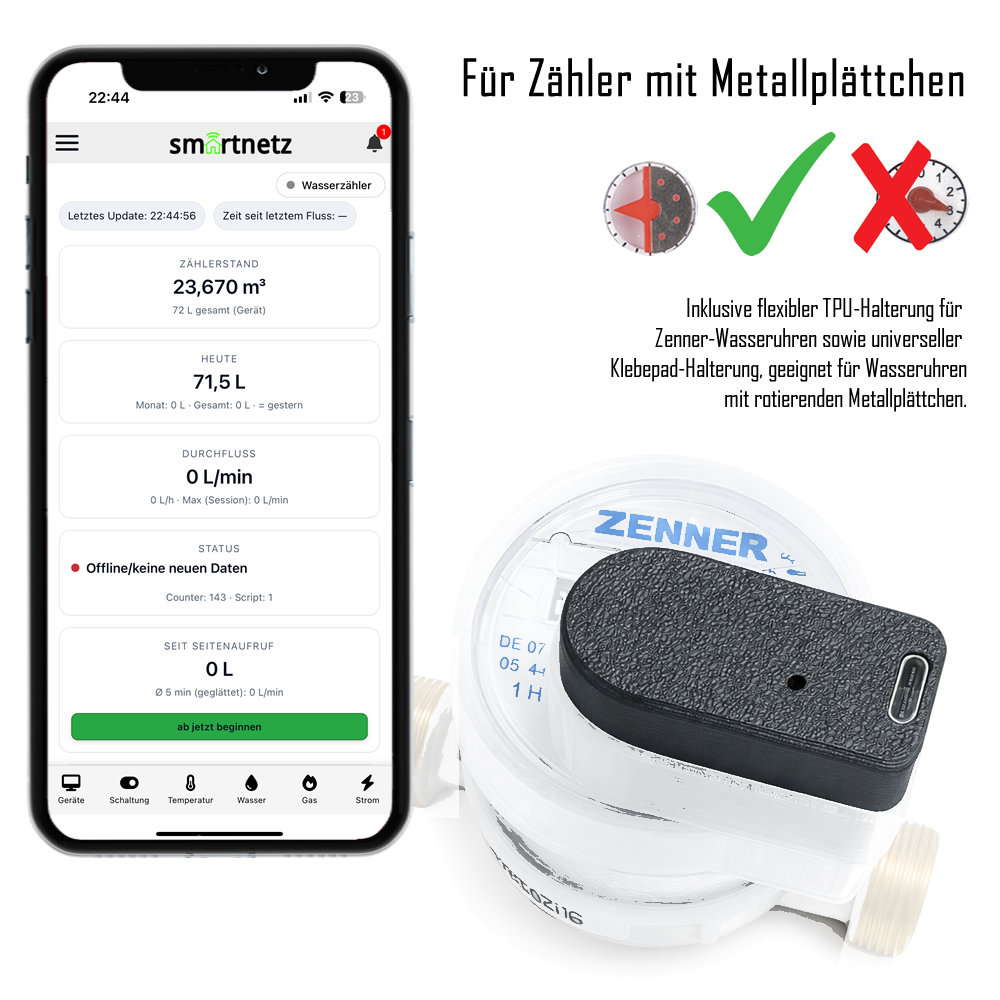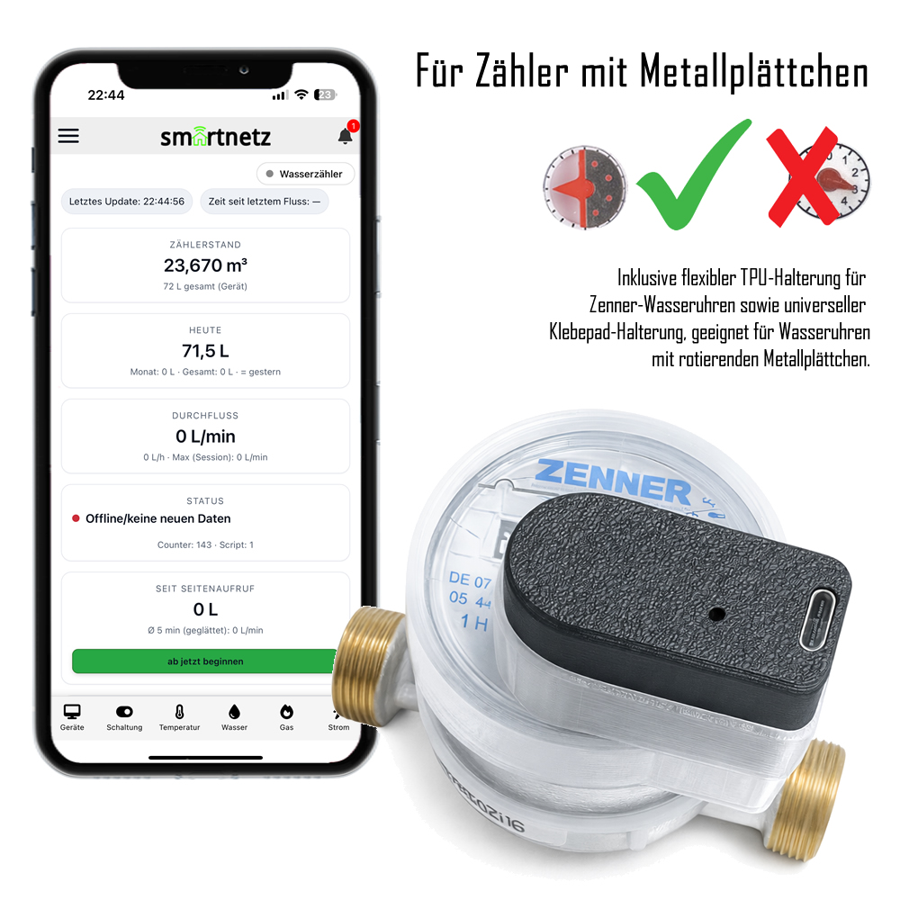 SMARTNETZ WASSERREADER inkl. Zenner Wasseruhr BL 110mm 3/4" (BIG BUNDLE) Plug & Play / Einrichtung via Smartnetz App - TASMOTA 32 / Version 15.1 in Deutsch vorinstalliert Homeassistant | WLAN | MQTT | Matter | Wifi | USBC